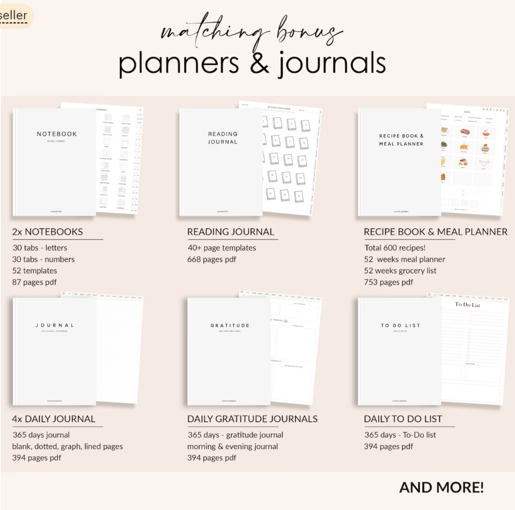 x1 2025 Digital Planner, x1 Undated Digital Planner, FREE x6 Bonus Matching Pack (including Notebook, Reading Journal, Recipe Journal, Gratitude Journal & To-do-List) + 32 Editable Planner Cover Designs