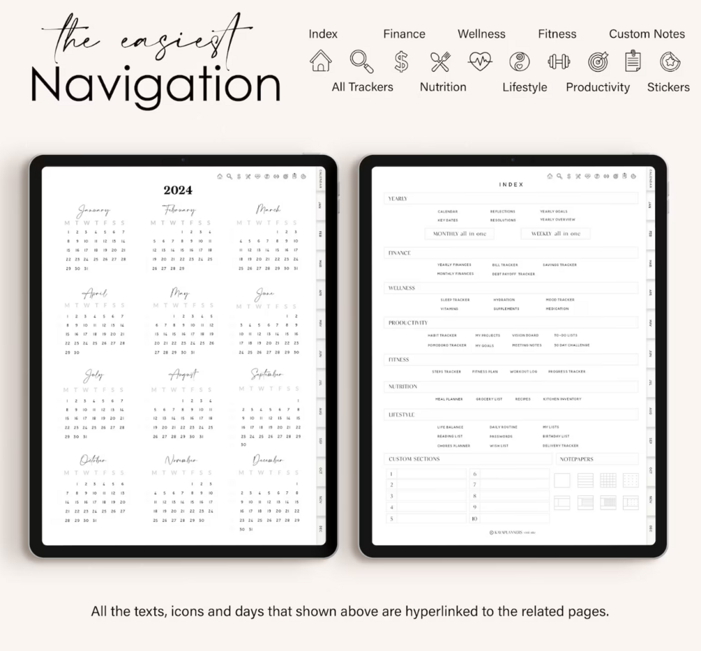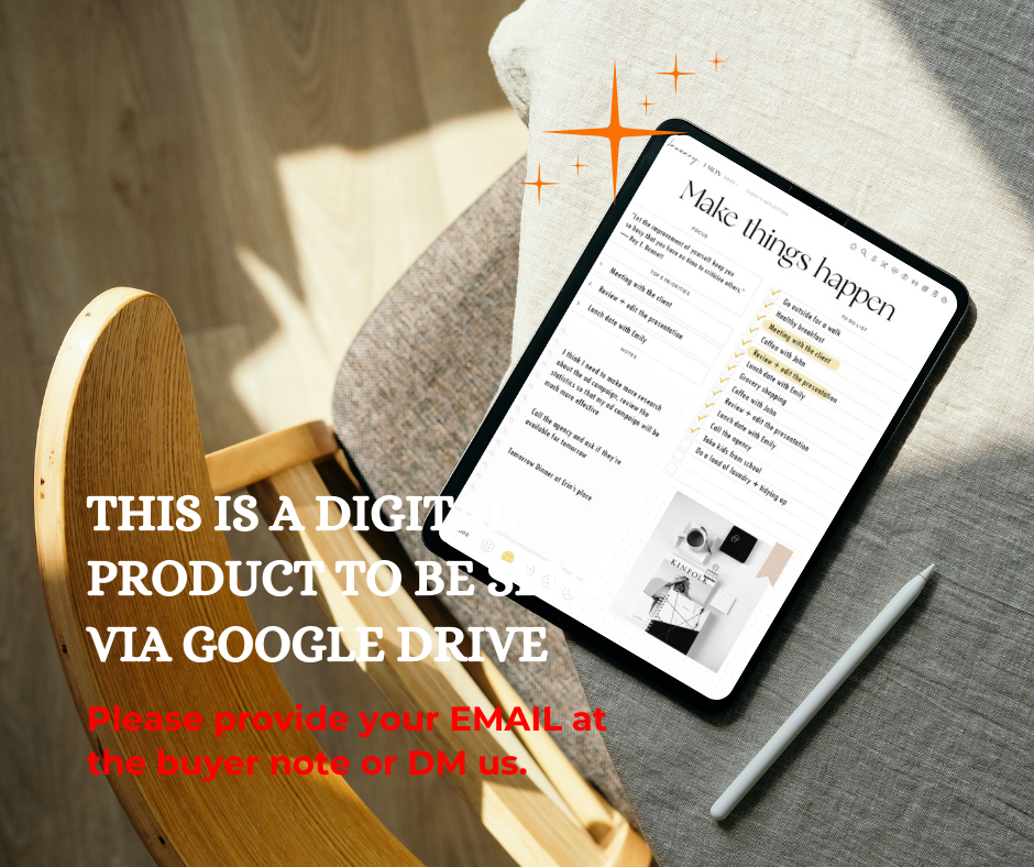 This product is a digital planner in pdf file that you can jump page to page thanks to the hyperlinks. To be able to use it you need to have a pdf annotation app like GoodNotes, Notability, Samsung Notes, ZoomNotes, Noteshelf, Xodo etc. installed on your device. It works well both on iPad and Android Tablet.