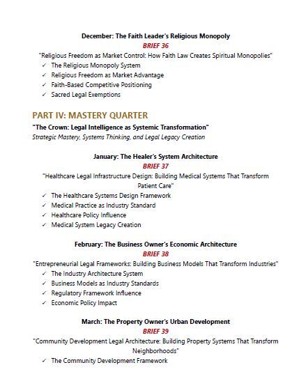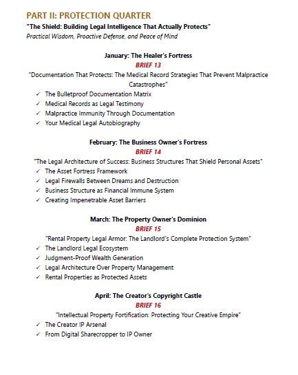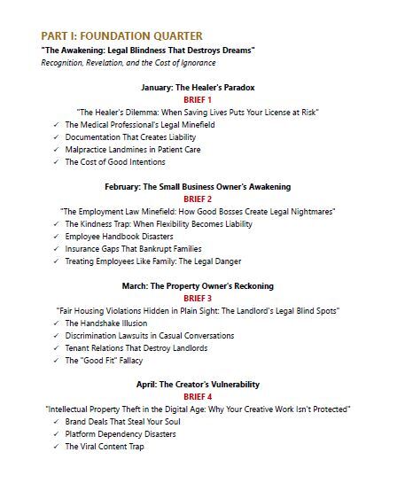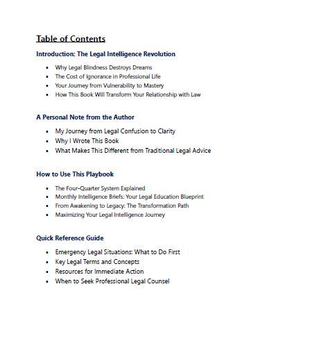 This isn't another legal self-help book filled with generic advice and theoretical concepts. This is a year-long transformation system that takes you from legal vulnerability to legal mastery through systematic intelligence briefs designed specifically for the modern economy.
