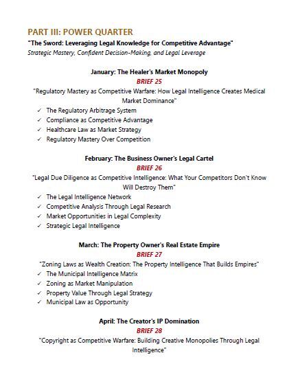 Quarter 3: The Sword - We weaponize legal knowledge to dominate markets. While competitors struggle with compliance, you're using legal complexity to eliminate competition.