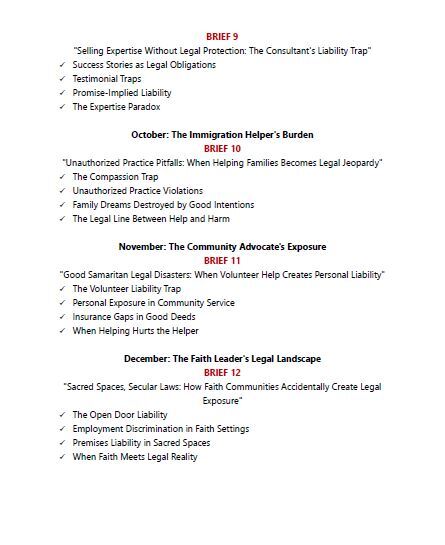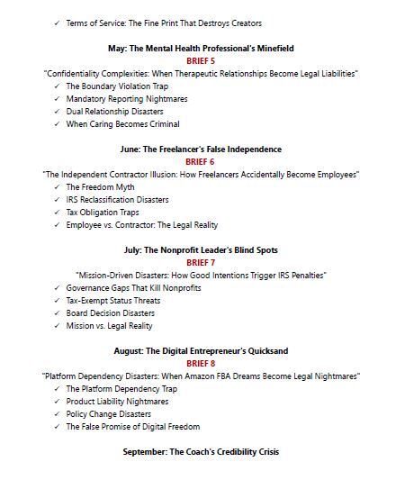 Each month focuses on a specific professional archetype, from medical practitioners and small business owners to nonprofit leaders and faith communities. Every intelligence brief is crafted to address the unique legal vulnerabilities and opportunities within that professional ecosystem.